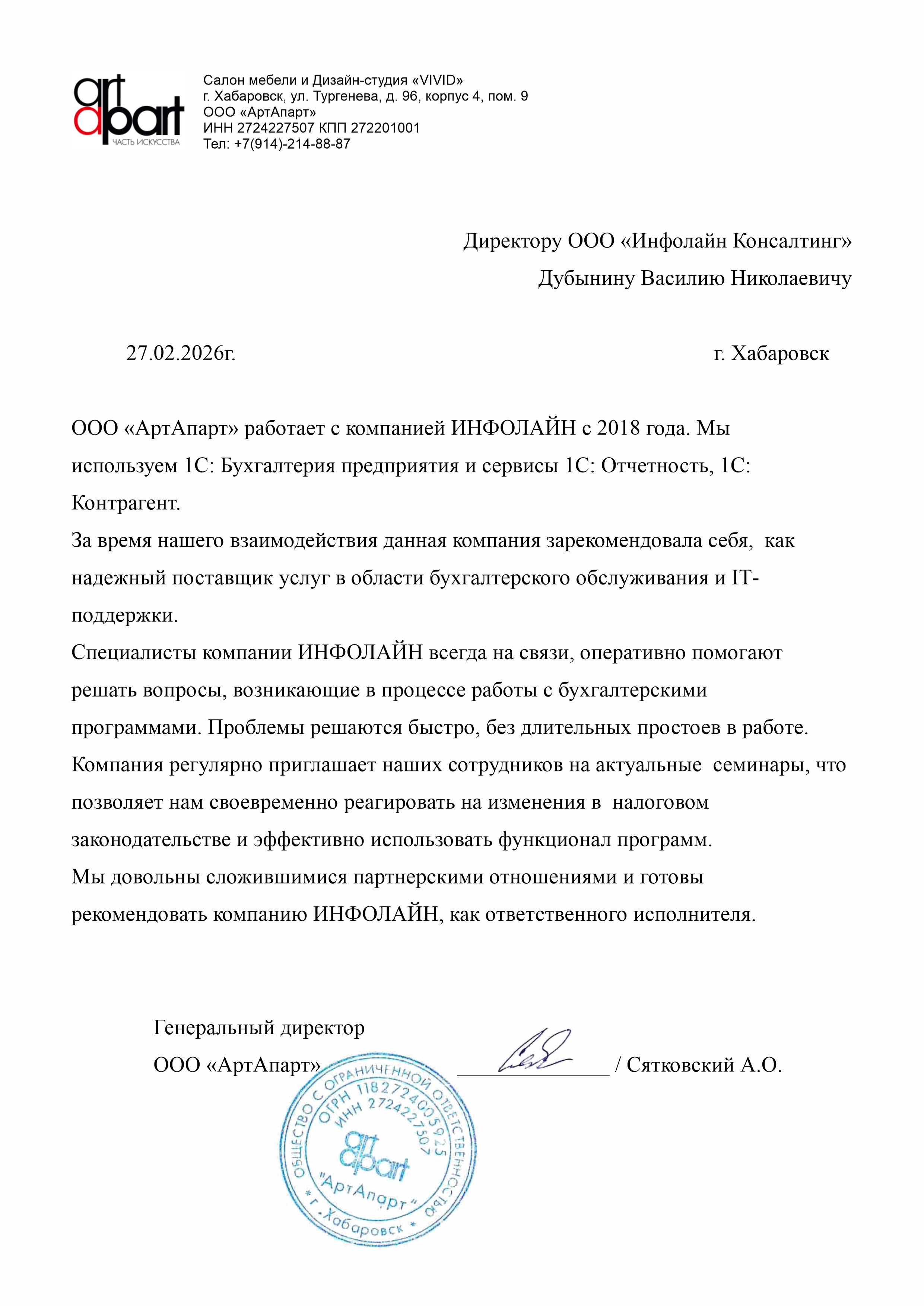 Сотрудничество с ООО «АртАпарт» подтверждает эффективность системного подхода к сопровождению 1С. «Инфолайн» обеспечивает стабильность учётных процессов, помогает своевременно адаптироваться к изменениям законодательства и снижает риски простоев в работе бухгалтерии.
