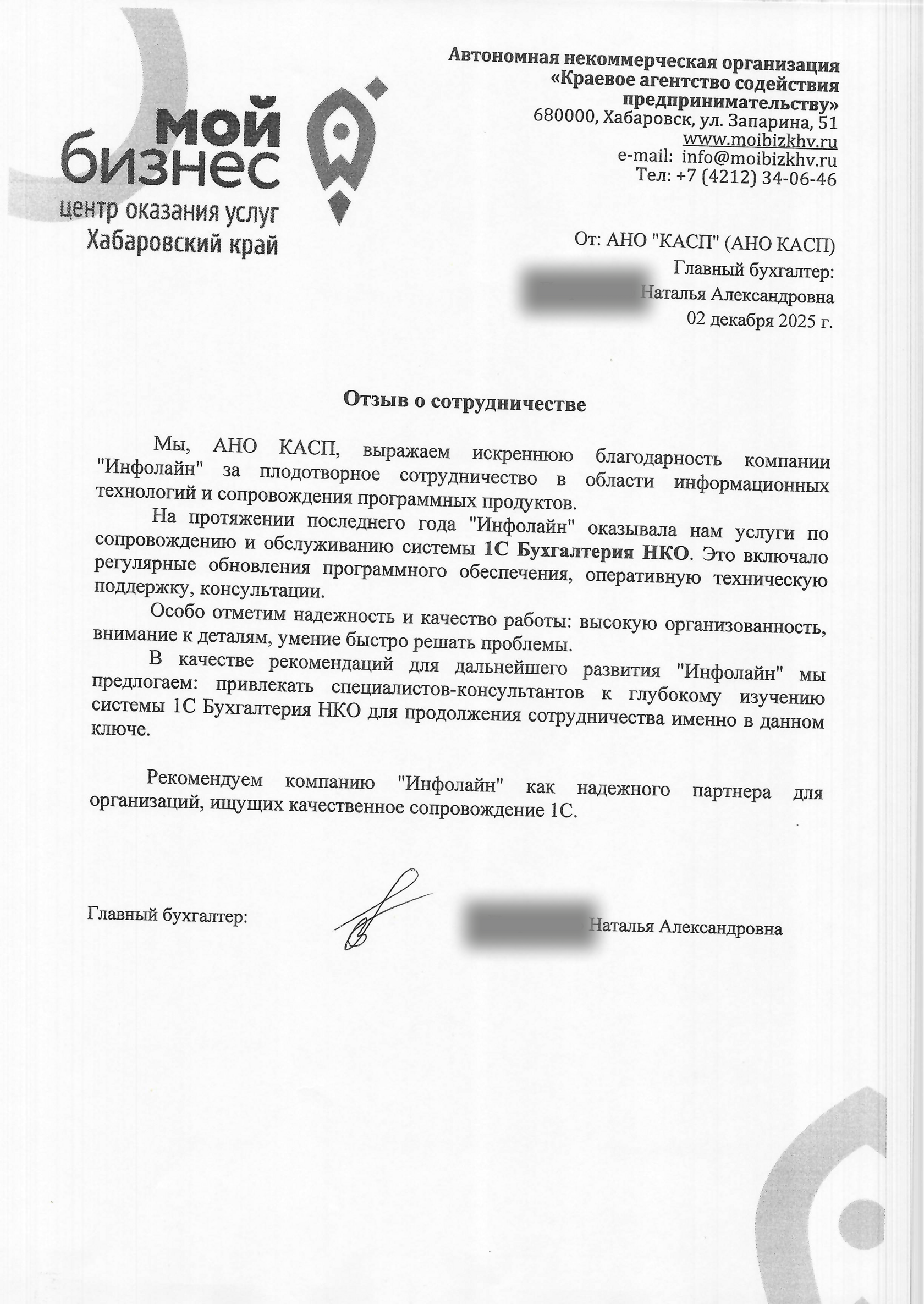«Мы, АНО КАСП, выражаем искреннюю благодарность компании "Инфолайн" за плодотворное сотрудничество в области информационных технологий и сопровождения программных продуктов. На протяжении последнего года "Инфолайн" оказывала нам услуги по сопровождению и обслуживанию системы 1С Бухгалтерия НКО. Это включало регулярные обновления программного обеспечения, оперативную техническую поддержку, консультации. Особо отметим надежность и качество работы: высокую организованность, внимание к деталям, умение быстро решать проблемы. В качестве рекомендаций для дальнейшего развития "Инфолайн" мы предлагаем: привлекать специалистов-консультантов к глубокому изучению системы 1С Бухгалтерия НКО для продолжения сотрудничества именно в данном ключе. Рекомендуем компанию "Инфолайн" как надежного партнера для организаций, ищущих качественное сопровождение 1С.»